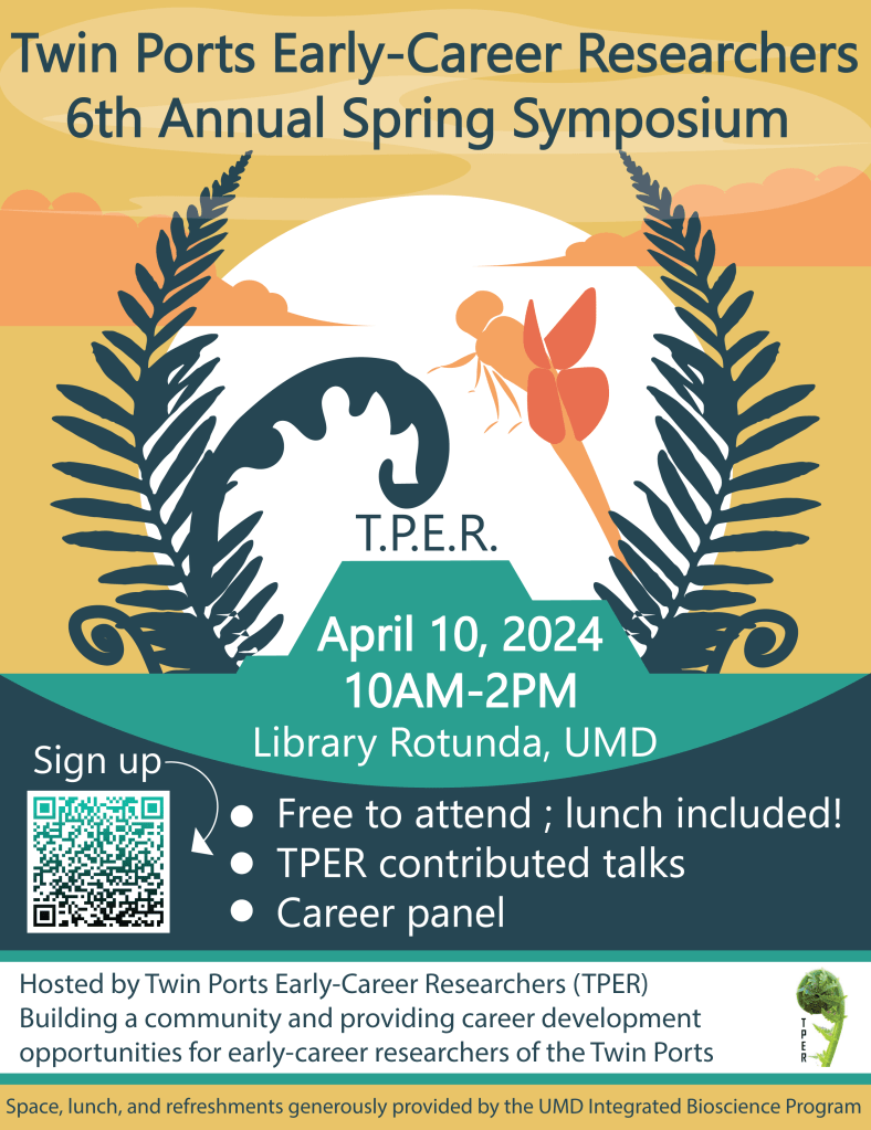 The Spring Symposium will be held on April 10th 2025 at the UMD Library Rotunda from 10am to 2pm. The event will include opportunities for you to present your work, a panel of local scientists to speak about their journey to their current positions, and free lunch and refreshments sponsored by the Integrated Biosciences Program at the University of Minnesota Duluth.
