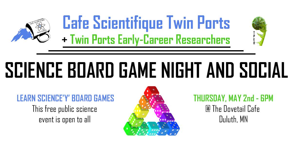 We are excited to announce Café Scientifique Twin Ports and TPER are teaming up for a science board game night and social on Thursday, May 2nd at 6pm at Dovetail Café in Duluth.