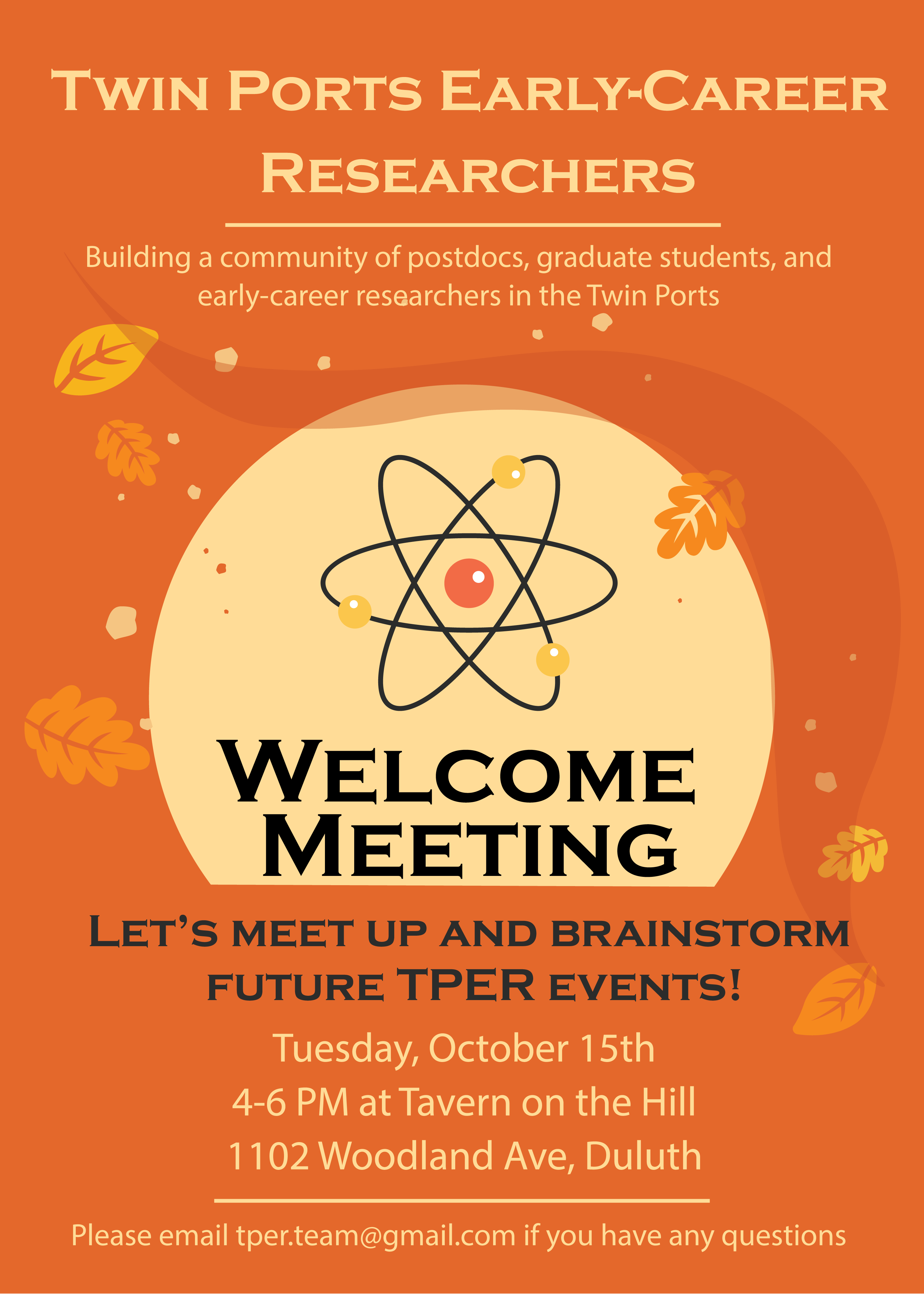 Come meet us at our welcome meeting Tuesday, October 15th from 4-6 PM at Tavern on the Hill! This is an informal event to meet up and brainstorm future TPER events. Everyone is welcome.